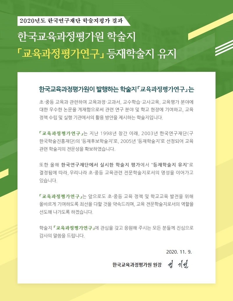 - [일반공지] [한국교육과정평가원] 2020년도 학술지 평가 결과「교육과정평가연구」등재학술지 유지 안내